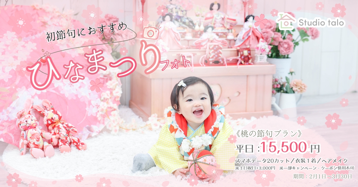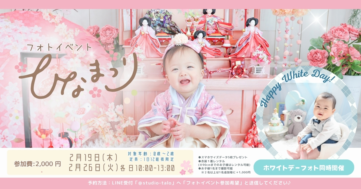 2月開催✨ ひな祭り&ホワイトデーフォトイベント💌2月開催💖ひな祭り&ホワイトデーフォトイベントを同時開催します💐Studio taloのオリジナル背景で桃の節句やホワイトデーの記念となるお子様の写真を残しませんか?ひな祭りorホワイトデー背景のどちらか、もしくはどちらも撮影可能です!ご希望…