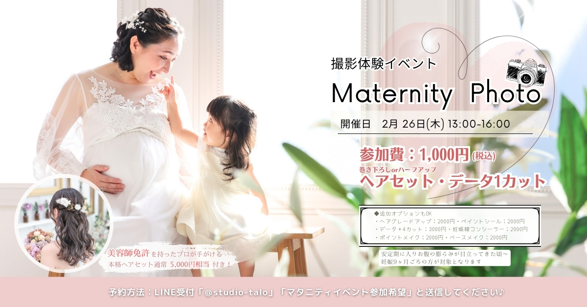 2月マタニティ撮影体験🤰✨Studio taloのイベントの中でも大人気のフォトインベントを2026年2月26日(木)にて開催します!!当店のマタニティフォトはデータ30カット含む衣装やヘアメイク付きの内容充実の撮影プランとなっておりますが、今回の撮影体験・フォトイベントでは衣装・ヘアメイクはその…