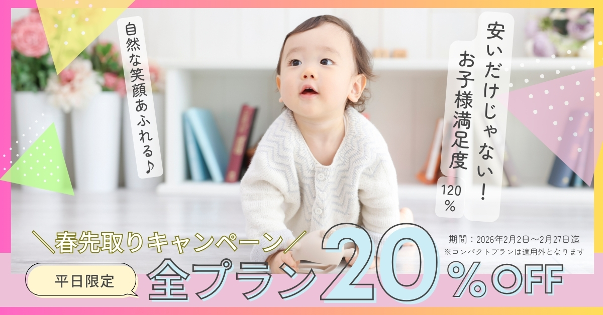 <平日限定>全プラン20%OFFキャンペーン!!✨大好評キャンペーン!始動全プラン対象にて✨ ※一部対象外プランあり<平日限定>撮影料+データ料より20%オフの豪華キャンペーン🌷 予約受付開始いたしました!!「予約フォーム」より予約受付中✨※2月2日(月)〜2月27日(金)の期間中に「撮影をされる方…