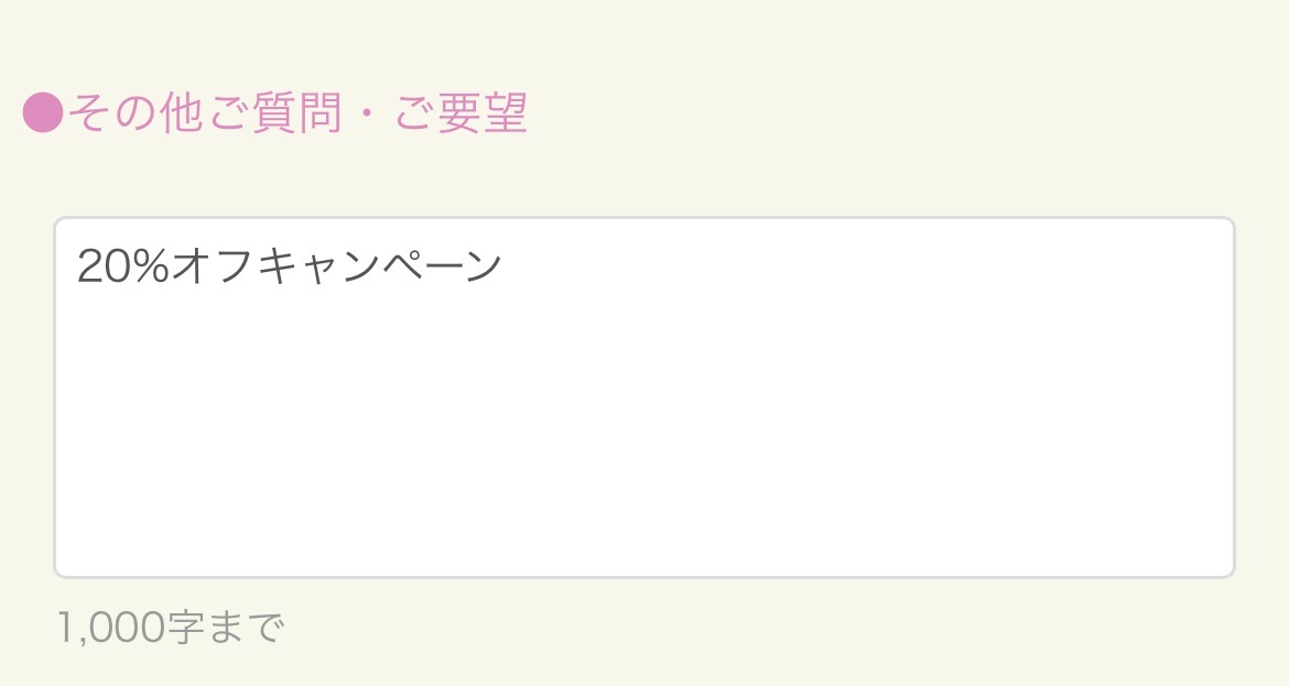 ご予約時のフォーム備考欄へ《20%オフキャンペーン》とご入力頂いた方が割引の適用対象となります。