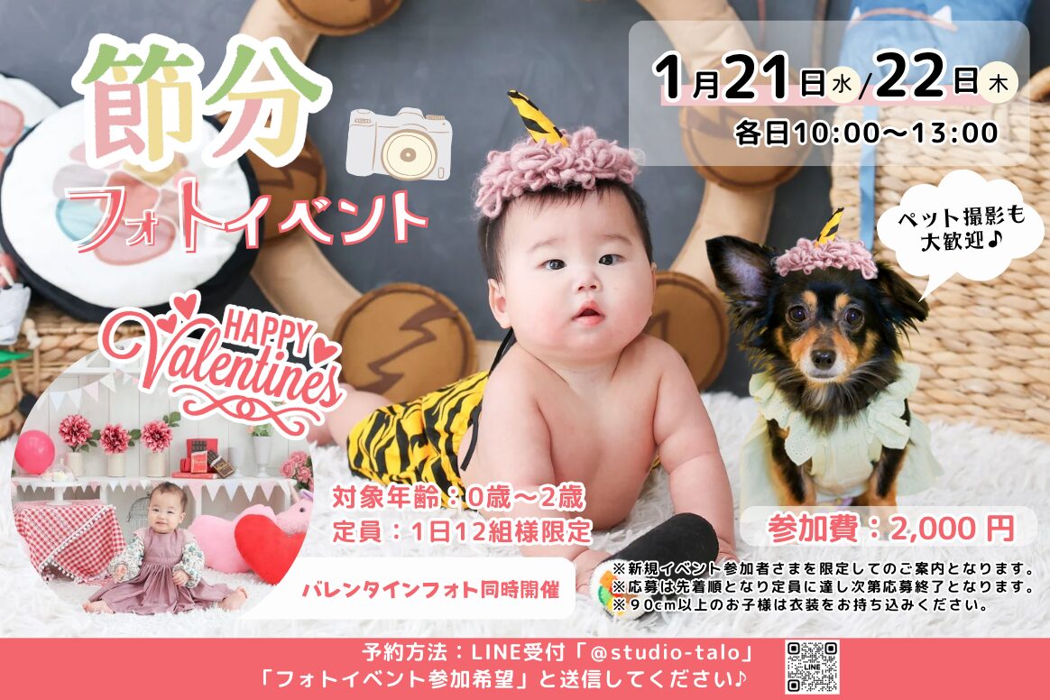 【2026年1月開催✨】節分&バレンタインフォトイベント💝新年最初のフォトイベントとして、節分とバレンタインをテーマにしたフォトイベントを開催します✨Studio taloオリジナルの背景で、節分やバレンタインの季節感を取り入れたお子様の記念写真を残しませんか?💐撮影背景は《節分背景》《バレンタイン…